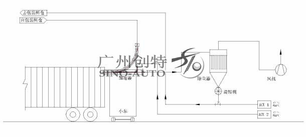 通過(guò)風(fēng)機(jī)吹送,把物料送入集裝箱內(nèi),充填能力大于5噸/小時(shí)。